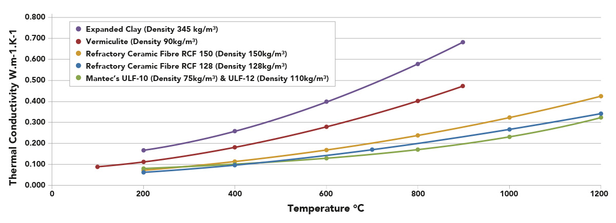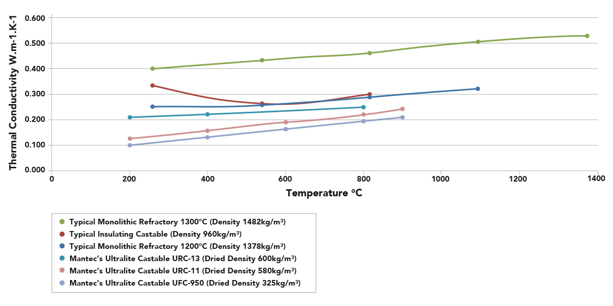 The two graphs below show a comparison of material densities & thermal conductivities, in which Ultralite refractory products can be seen with the lowest values particularly at elevated temperatures (above 1000°C /1832°F).